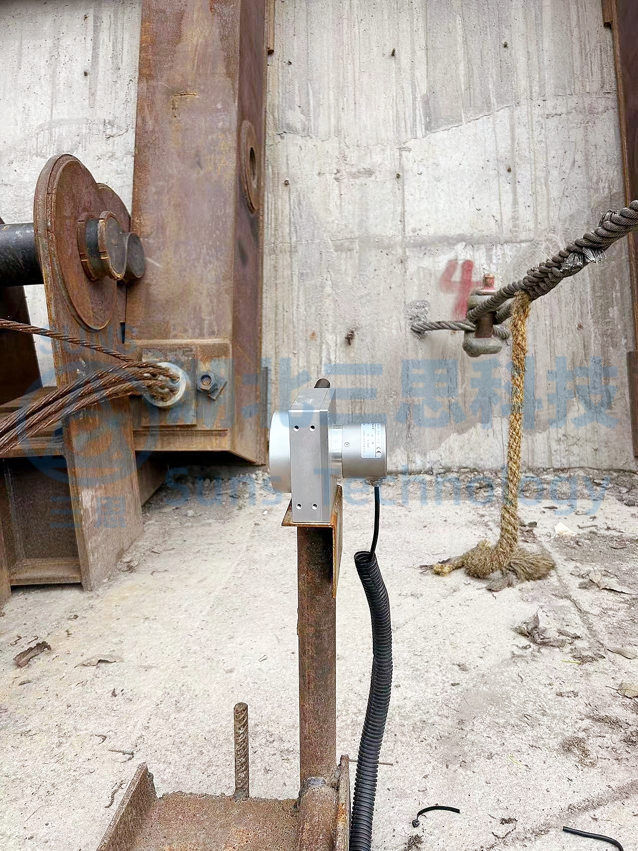 通過在兩岸錨樁位置加裝拉升編碼器,免焊安裝并與錨墩位置固定,通過模擬量信號傳送至各自的卷揚機處PLC。經(jīng)過系統(tǒng)判斷是否出現(xiàn)錨樁位移現(xiàn)象,輸出信號給現(xiàn)地操作系統(tǒng),決定是否能夠正常工作。