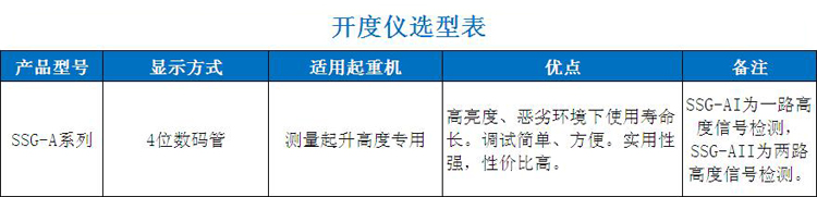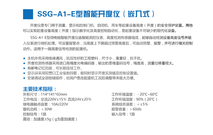 產(chǎn)品詳情 功能介紹 產(chǎn)品優(yōu)勢 產(chǎn)品參數(shù) 包裝清單 產(chǎn)品詳情 SSG-AⅠ-E型微電腦智能開度儀由智能測控儀表、高度檢測傳感器組成,能夠自動檢測設(shè)備高度信號并輸入儀表進(jìn)行微機處理。可設(shè)置報警點,當(dāng)高度上下限超過預(yù)警高度后,可自動預(yù)警、報警,并可進(jìn)行相關(guān)控制動作。適用于一路高度信號檢測的起重機。 功能介紹 產(chǎn)品優(yōu)勢 產(chǎn)品參數(shù) 包裝清單