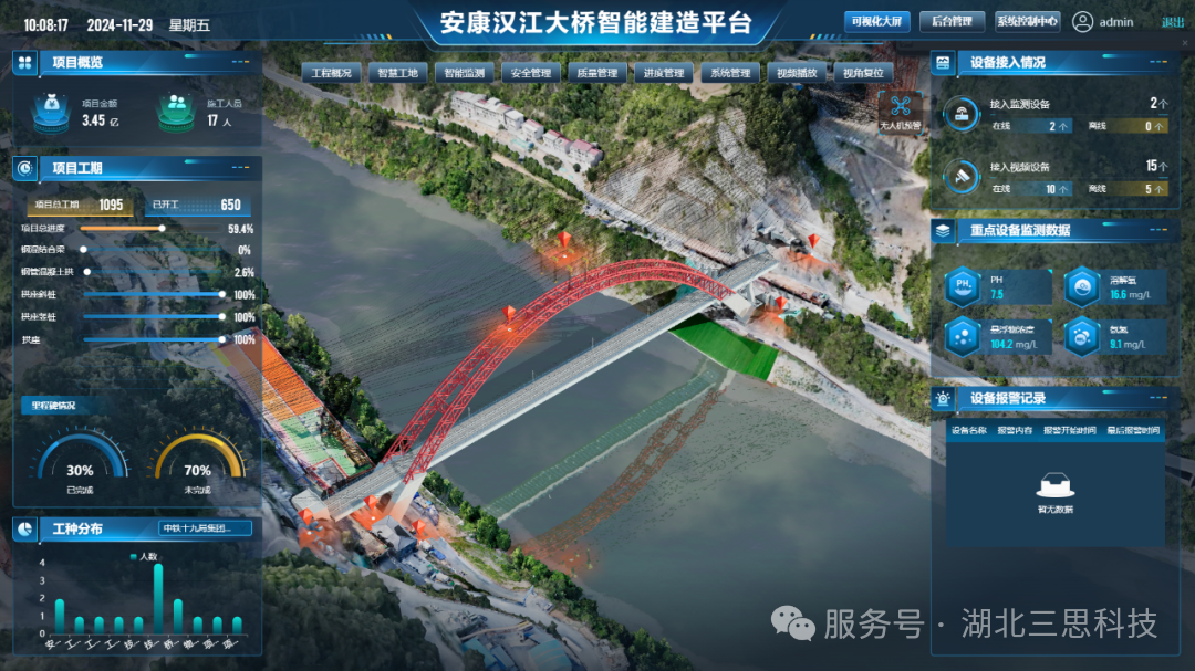 平臺(tái)主要分為3D前端可視化、工程概況、智慧工地、智能監(jiān)測(cè)、安全管理、質(zhì)量管理、進(jìn)度管理等8個(gè)模塊,主要綜合了互聯(lián)網(wǎng)、三維建模、視頻監(jiān)控、BIM、智能化等現(xiàn)代技術(shù),融合了智慧工地可視化、橋梁3D建模,施工進(jìn)度可視化、工程管理、安全管理、質(zhì)量管理、進(jìn)度管理、數(shù)據(jù)分析、設(shè)備管理和告警等關(guān)鍵功能,建設(shè)數(shù)字化工程管控平臺(tái),為安康漢江大橋的安全生產(chǎn)管理提供信息化支撐。通過(guò)可視化場(chǎng)景、數(shù)據(jù)管理、分析和合規(guī)性支持,幫助橋梁項(xiàng)目和設(shè)施管理者更高效地監(jiān)測(cè)、管理和維護(hù)基礎(chǔ)設(shè)施,降低成本、風(fēng)險(xiǎn)和停機(jī)時(shí)間,推動(dòng)項(xiàng)目成功交付和可持續(xù)性發(fā)展。