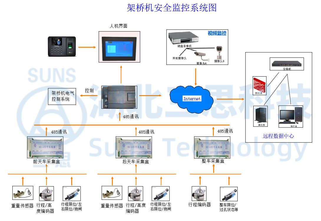 湖北三思科技自主研發(fā)的SSL-CB型架橋機(jī)安全監(jiān)控管理系統(tǒng)由視頻監(jiān)控系統(tǒng)和安全監(jiān)控系統(tǒng)組成。架橋機(jī)現(xiàn)場(chǎng)實(shí)時(shí)作業(yè)數(shù)據(jù)和視頻,可通過(guò)Internet網(wǎng)絡(luò)傳輸至遠(yuǎn)端服務(wù)器,以便隨時(shí)察看分析。存儲(chǔ)在服務(wù)器的作業(yè)數(shù)據(jù),能夠反映架橋機(jī)工作狀況,如作業(yè)周期、超載情況、各行程高度是否超范圍等。通過(guò)分析一段時(shí)間內(nèi)的數(shù)據(jù)形成各作業(yè)報(bào)表,以幫助作業(yè)調(diào)度和管理,可以保障施工安全和智能化管理維護(hù),讓起重機(jī)發(fā)揮出更大效益。